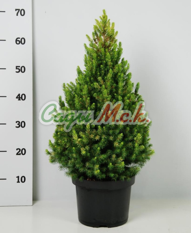 Ель канадская Conica - карликовая конусовидная форма. Высота 3-4 м, диаметр кроны 2 м. Годовой прирост в высоту 6-10 см, в ширину 3-5 см. В 35 лет высота 3,6 м у некоторых экземпляров. Самое старое растение в возрасте 60 лет имеет высоту 4 м. Крона густая. Хвоя мягкая, светло-зеленая. Сорт используется при одиночных посадках, в группах, альпинариях. Ель канадская Коника декоративна благодаря правильной, конической форме кроны.